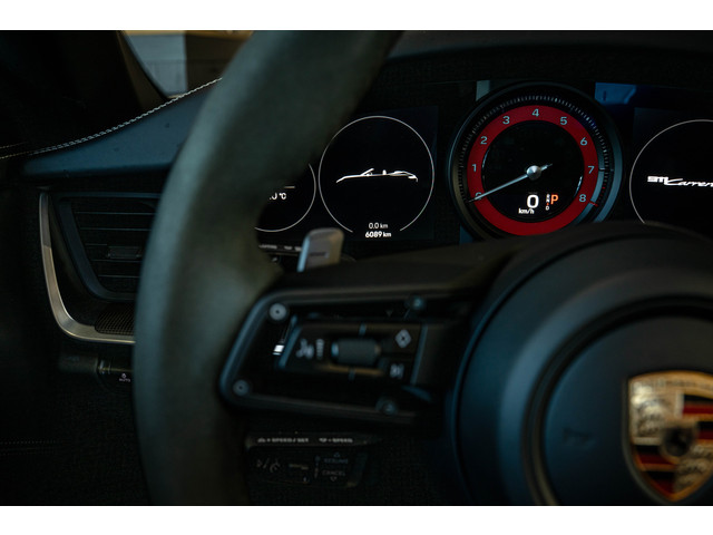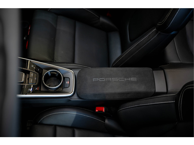 - P 6E5 Porsche embleem op de middenconsole in Alcantara